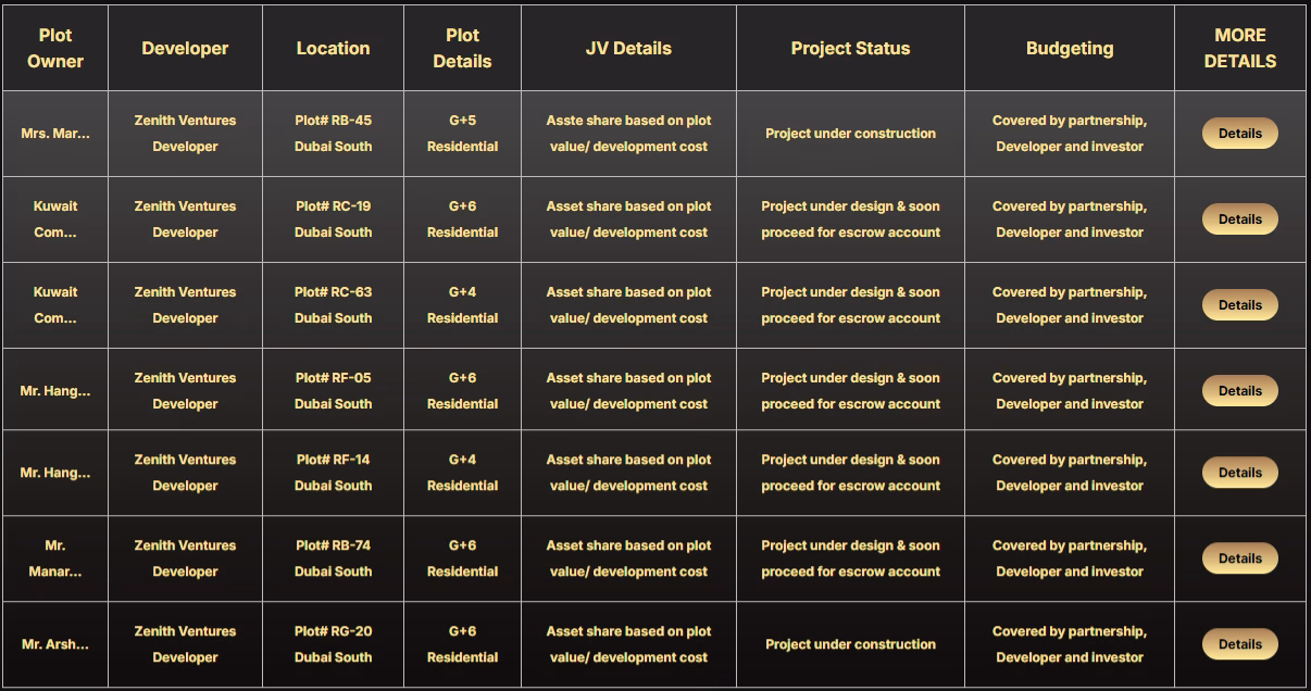 Zenith Venture Real Estate Development, based in Dubai, offers pooled investment partnerships alongside other investment models. Zenith first acquires the plot and completes the design phase. After that, Zenith announces the pooled investment opportunity to registered interested investors.